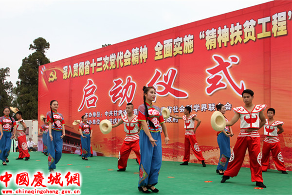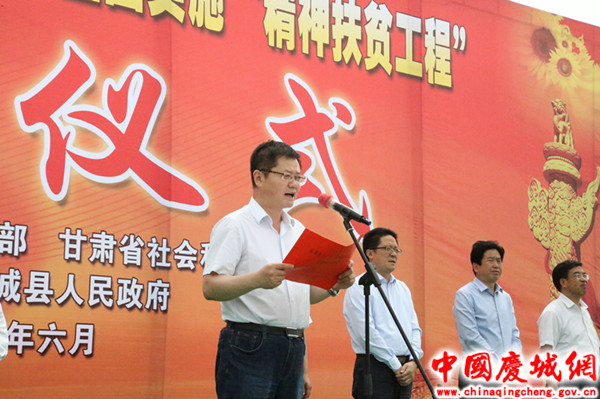 在启动仪式上,省社科联秘书长崔建伟为“全省精神扶贫工程”示范村─玄马镇柏树村授牌,并宣布全省“精神扶贫工程”正式启动,市委常委、宣传部长闫晓峰致辞,县委副书记、县长梁世刚介绍全县精准扶贫工作开展情况,庆城县委书记葛宏主持启动仪式。