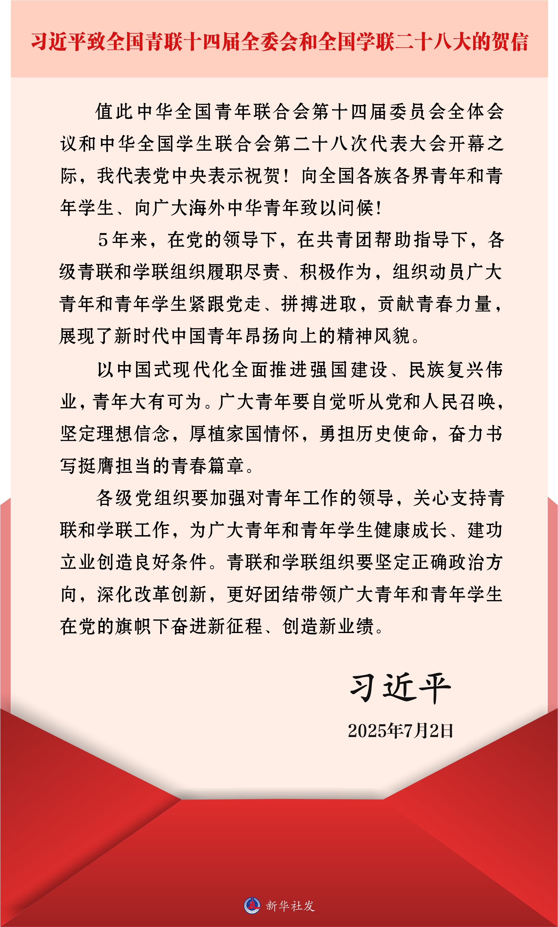 新华社北京7月2日电 中华全国青年联合会第十四届委员会全体会议、中华全国学生联合会第二十八次代表大会2日上午在京开幕。中共中央总书记、国家主席、中央军委主席习近平发来贺信,代表党中央表示祝贺,向全国各族各界青年和青年学生、向广大海外中华青年致以问候。